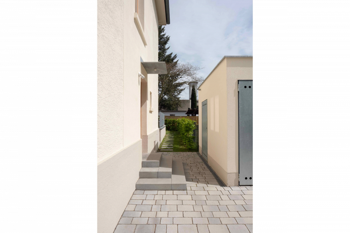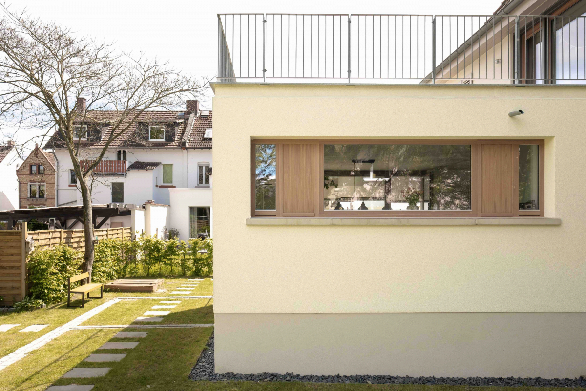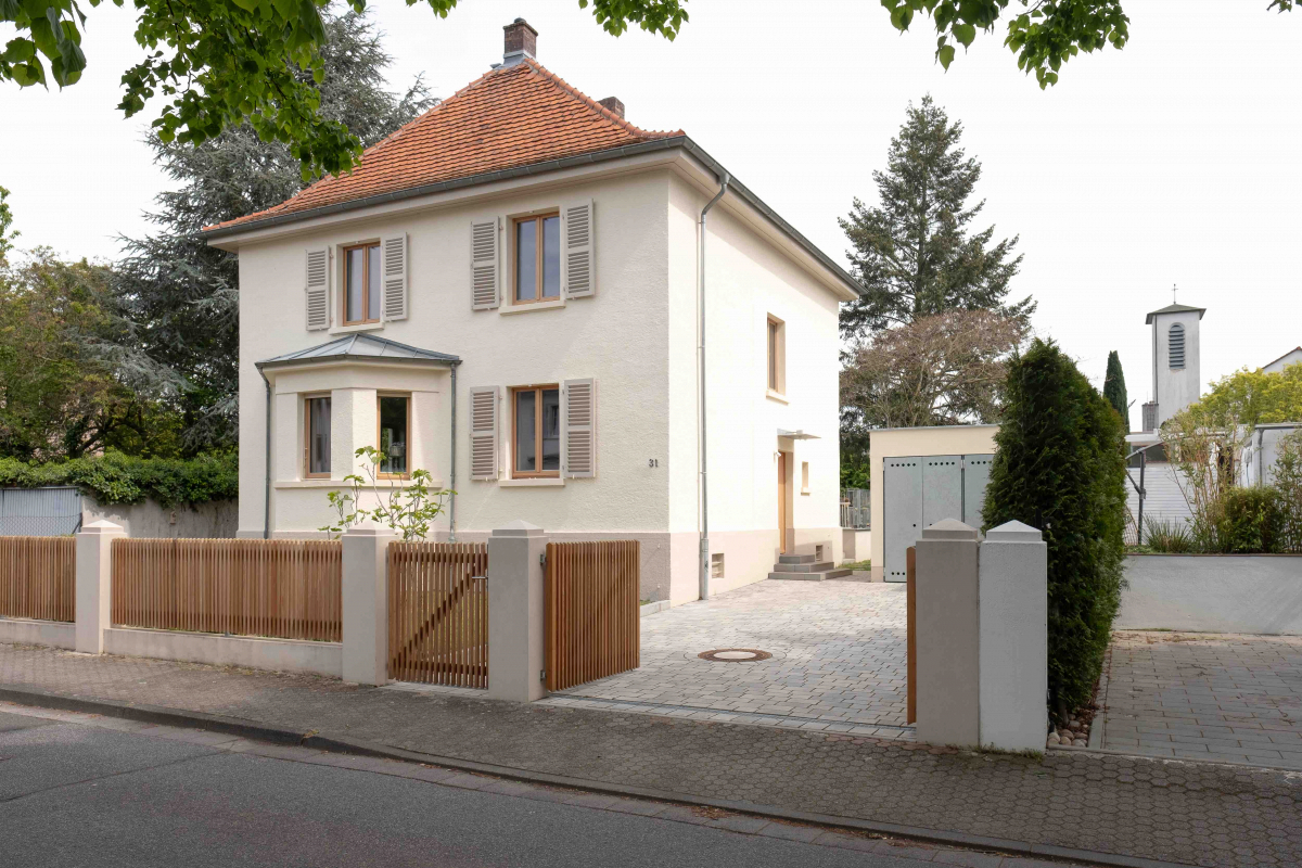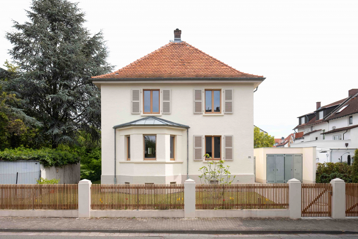 Das Pfarrhaus der Evangelischen Gemeinde in Hattersheim wurde 1927 zusammen mit der Evangelischen Kirche (1928) errichtet. Das Gebäude repräsentiert die für die Zeit und das städtebauliche Umfeld typische Bauweise eines Einfamilienhauses. Die Sanierung erfolgt deshalb mit möglichst geringen Änderungen an der äußeren Gestalt mit Ausnahme des eingeschossigen Anbaus an der Ostseite. Die energetische Sanierung wird konsequent mit einer Innendämmung ausgeführt, die bestehenden Holzdielenböden überarbeitet, Terrazoböden im Treppenhaus abgeschliffen und instandgesetzt. Um das Gebäude weiterhin als Einfamilienhaus aber auch zu einem späteren Zeitpunkt mit zwei Familien bewohnen zu können, werden im Treppenhaus Wohnungsabschlüsse hergestellt. Das bestehende Gebäude wird umgebaut und durch einen Anbau erweitert. Das Haus wird zunächst von einer Familie bewohnt, kann optional aber auch in zwei Wohneinheiten unterteilt werden. Der eingeschossige, flach gedeckte Anbau wird aus Poroton Ziegelmauerwerk errichtet und anschließend verputzt. Ziegelmauerwerk und Putzfassade verbinden den Neubau auf selbstverständliche Weise mit dem Bestand, der 1927 - wenn auch mit einem anderen Energiestandard - ebenso ausgefürt wurde. Das begehbare Flachdach auf dem Anbau und eine Terrasse auf Sockelhöhe stellen hochwertige, private Außenräume für das Erd- und Obergeschoss dar.