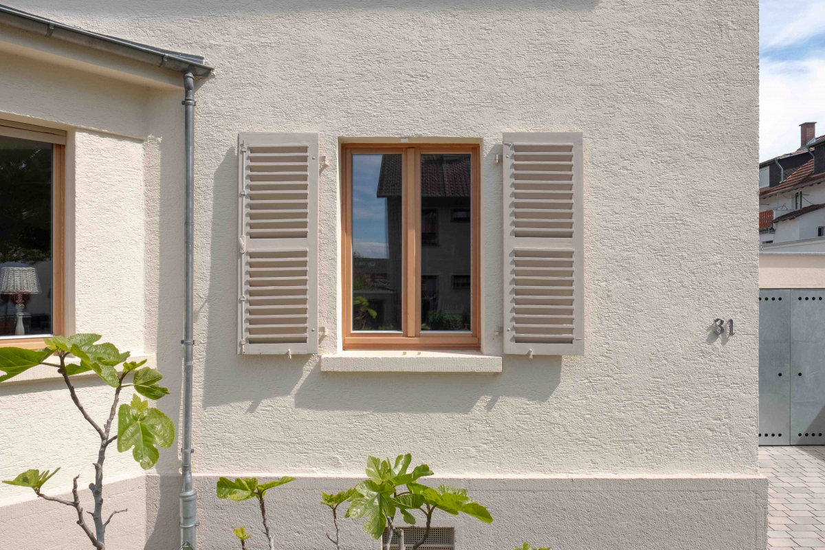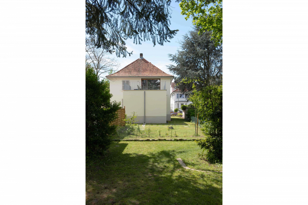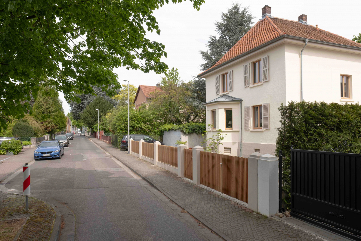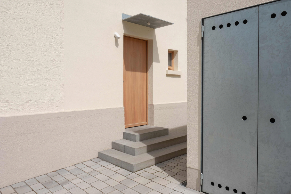 Das Pfarrhaus der Evangelischen Gemeinde in Hattersheim wurde 1927 zusammen mit der Evangelischen Kirche (1928) errichtet. Das Gebäude repräsentiert die für die Zeit und das städtebauliche Umfeld typische Bauweise eines Einfamilienhauses. Die Sanierung erfolgt deshalb mit möglichst geringen Änderungen an der äußeren Gestalt mit Ausnahme des eingeschossigen Anbaus an der Ostseite. Die energetische Sanierung wird konsequent mit einer Innendämmung ausgeführt, die bestehenden Holzdielenböden überarbeitet, Terrazoböden im Treppenhaus abgeschliffen und instandgesetzt. Um das Gebäude weiterhin als Einfamilienhaus aber auch zu einem späteren Zeitpunkt mit zwei Familien bewohnen zu können, werden im Treppenhaus Wohnungsabschlüsse hergestellt. Das bestehende Gebäude wird umgebaut und durch einen Anbau erweitert. Das Haus wird zunächst von einer Familie bewohnt, kann optional aber auch in zwei Wohneinheiten unterteilt werden. Der eingeschossige, flach gedeckte Anbau wird aus Poroton Ziegelmauerwerk errichtet und anschließend verputzt. Ziegelmauerwerk und Putzfassade verbinden den Neubau auf selbstverständliche Weise mit dem Bestand, der 1927 - wenn auch mit einem anderen Energiestandard - ebenso ausgefürt wurde. Das begehbare Flachdach auf dem Anbau und eine Terrasse auf Sockelhöhe stellen hochwertige, private Außenräume für das Erd- und Obergeschoss dar.